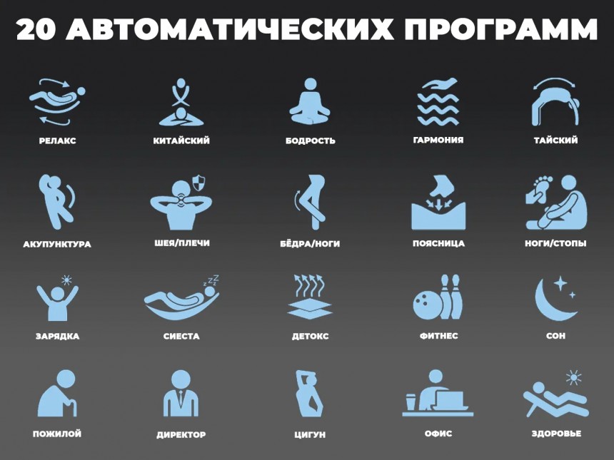 • 20 авто программ применяют различные методики японской и китайской гимнастики оздоровления