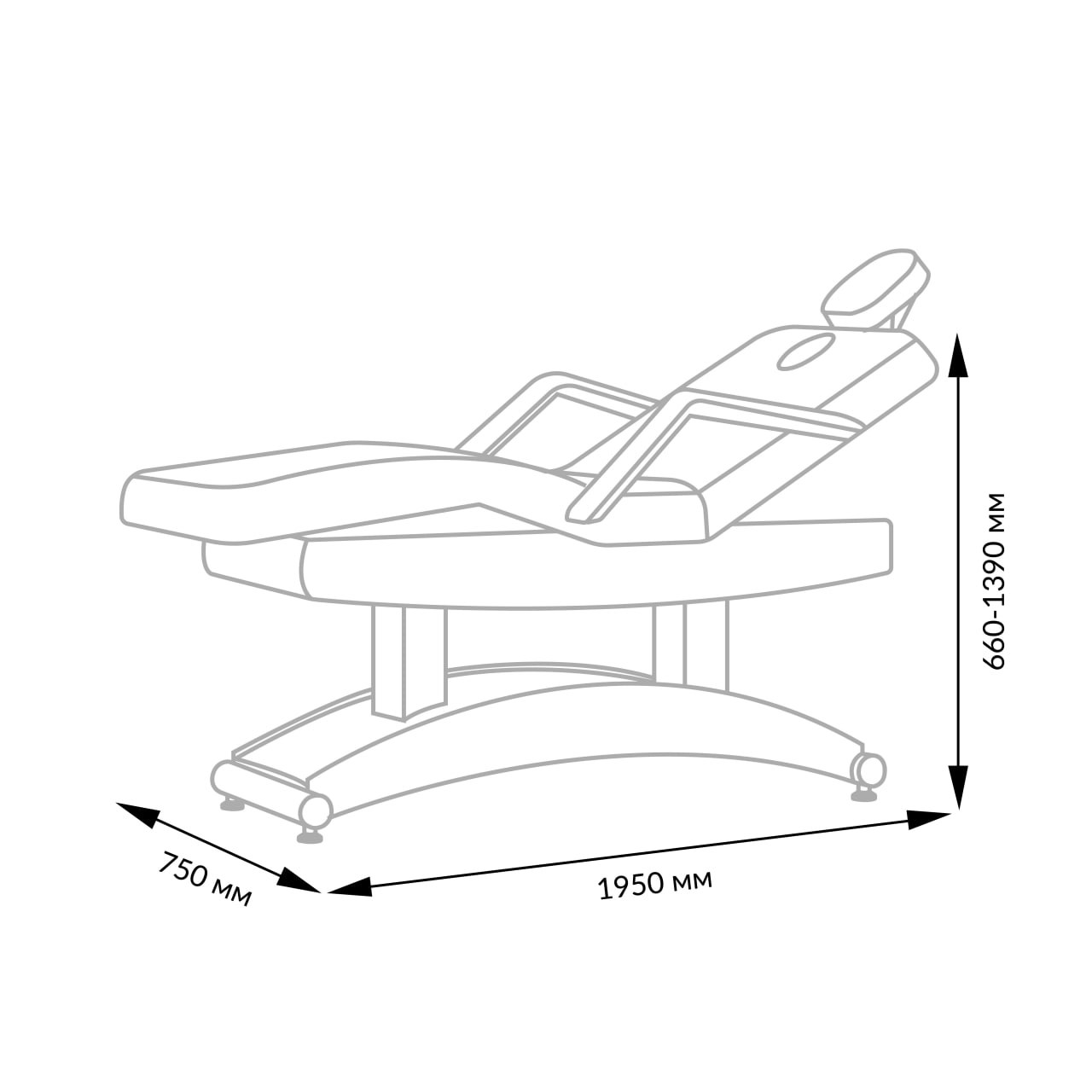 Комплектация: кушетка, подлокотники, съемная подушка, элементы каркаса и основания, электропривод с двумя электромоторами и дистанционным пультом управления.